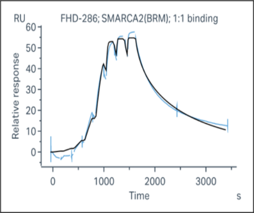 活性验证:SPR法检测Biotin-BRM蛋白的活性:将Biotin-BRM蛋白固定到SA芯片上,不同浓度的化合物流经Biotin-BRM蛋白的固定表面,并记录响应信号。动力学拟合结果如下,kD值约为4.29x10-9 M。