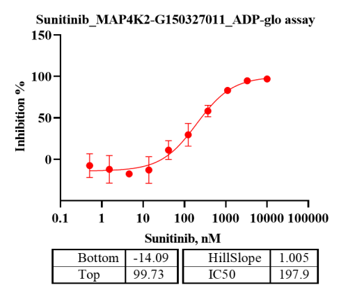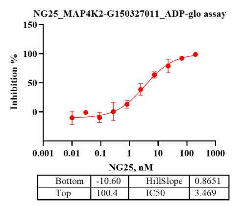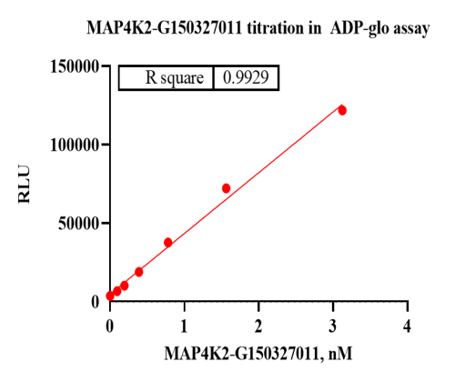 活性验证:ADP-Glo法检测MAP4K2蛋白的活性:将MAP4K2蛋白、ATP和底物在25℃下孵育60分钟,加入ADP-Glo试剂,最后在BMG上读取RLU信号。