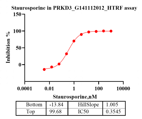 活性验证:一种基于HTRF的检测法量化测定PRKD3蛋白的活性:将PRKD3蛋白、ATP和底物在25℃下孵育60分钟,加入对应的供体和受体,并在25℃下继续保温60分钟,最后在BMG上读取665nm/620nm的荧光信号比值。