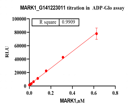 活性验证:ADP-Glo法检测MARK1蛋白的活性:将MARK1蛋白、ATP和底物在25℃下孵育60分钟,加入ADP-Glo试剂,最后在BMG上读取RLU信号。