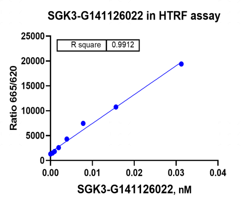 活性验证:一种基于HTRF的检测法量化测定SGK3蛋白的活性:将SGK3蛋白、ATP和底物在25℃下孵育60分钟,加入对应的供体和受体,并在25℃下继续保温60分钟,最后在BMG上读取665nm/620nm的荧光信号比值。