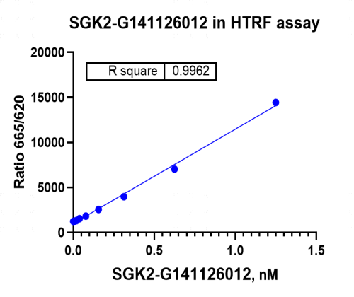 活性验证:HTRF法检测SGK2蛋白的活性:将SGK2蛋白、ATP和底物在25℃下孵育60分钟,加入对应的供体和受体,并在25℃下孵育60分钟,最后在BMG上读取665/620比值。