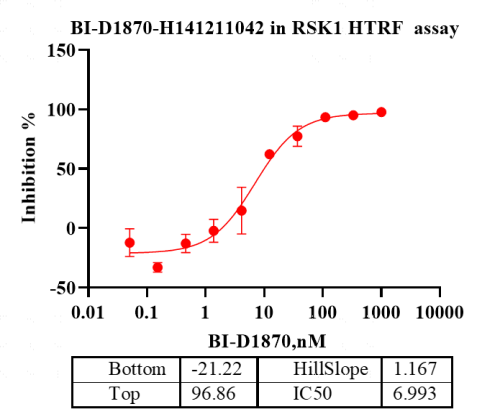 活性验证:HTRF法检测RSK1蛋白的活性:将RSK1蛋白、ATP和底物在25℃下孵育60分钟,加入对应的供体和受体,并在25℃下孵育60分钟,最后在BMG上读取665/620比值。