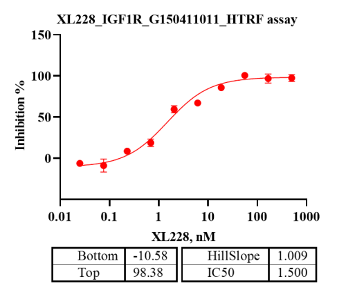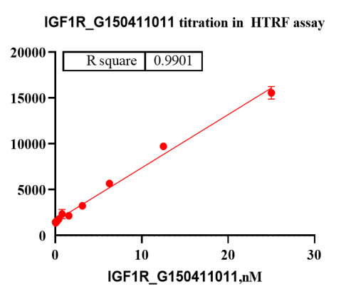 活性验证:HTRF法检测IGF1R蛋白的活性:将IGF1R蛋白、ATP和底物在25℃下孵育60分钟,加入对应的供体和受体,并在25℃下孵育60分钟,最后在BMG上读取665/620比值。