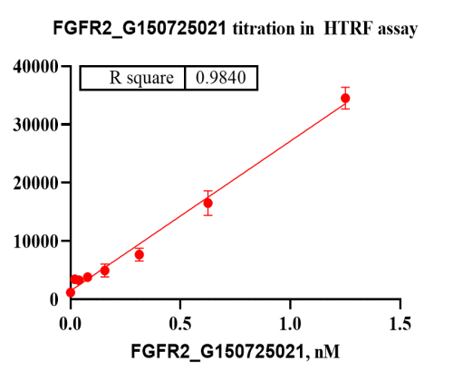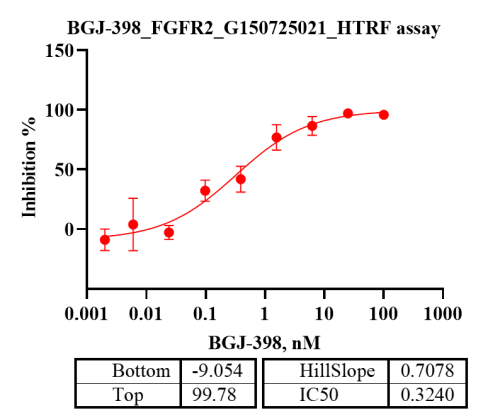 活性验证:HTRF法检测FGFR2蛋白的活性:将FGFR2蛋白、ATP和底物在25℃下孵育60分钟,加入对应的供体和受体,并在25℃下孵育60分钟,最后在BMG上读取665/620比值。