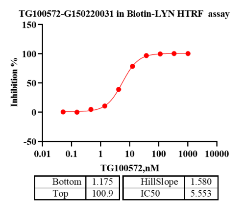 活性验证:HTRF法检测Biotin-LYN蛋白的活性:将Biotin-LYN蛋白、ATP和底物在25℃下孵育60分钟,加入对应的供体和受体,并在25℃下孵育60分钟,最后在BMG上读取665/620比值。