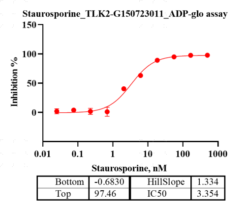活性验证:ADP-Glo法检测TLK2蛋白的活性:将TLK2蛋白、ATP和底物在25℃下孵育60分钟,加入ADP-Glo试剂,最后在BMG上读取RLU信号。