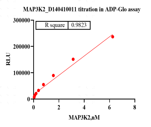 活性验证:ADP-Glo法检测MAP3K2蛋白的活性:将MAP3K2蛋白、ATP和底物在25℃下孵育60分钟,加入ADP-Glo试剂,最后在BMG上读取RLU信号。