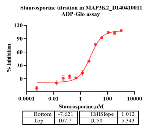 描述:带有N端GST标签与带有C端Flag标签的重组人MAP3K2蛋白通过GST亲和和SEC进行纯化。MAP3K2蛋白在ADP-Glo检测中显示出高活性。
