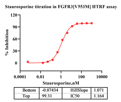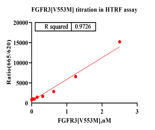 活性验证:HTRF法检测FGFR3[V553M]蛋白的活性:将FGFR3[V553M]蛋白、ATP和底物在25℃下孵育60分钟,加入对应的供体和受体,并在25℃下孵育60分钟,最后在BMG上读取665/620比值。