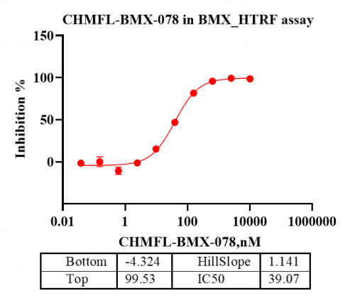 活性验证:HTRF法检测Biotin-BMX蛋白的活性:将Biotin-BMX蛋白、ATP和底物在25℃下孵育60分钟,加入对应的供体和受体,并在25℃下孵育60分钟,最后在BMG上读取665/620比值。