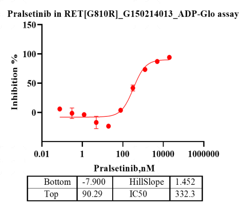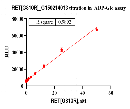 活性验证:ADP-Glo法检测RET[G810R]蛋白的活性:将RET[G810R]蛋白、ATP和底物在25℃下孵育120分钟,加入ADP-Glo试剂,最后在BMG上读取RLU信号。