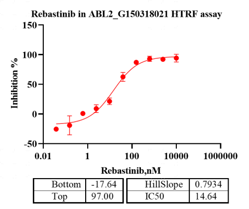 活性验证:HTRF法检测ABL2蛋白的活性:将ABL2蛋白、ATP和底物在25℃下孵育60分钟,加入对应的供体和受体,并在25℃下孵育60分钟,最后在BMG上读取665/620比值。