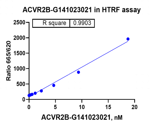 活性验证:HTRF法检测ACVR2B蛋白的活性:将ACVR2B蛋白、ATP和底物在25℃下孵育60分钟,加入对应的供体和受体,并在25℃下孵育60分钟,最后在BMG上读取665/620比值。