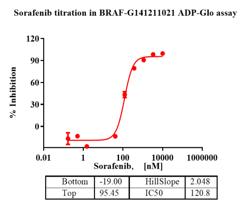描述:带有N端GST和C端His标签重组人BRAF蛋白通过Ni-NTA和GST亲和层析进行纯化。BRAF蛋白在ADP-Glo检测中显示出高活性。
