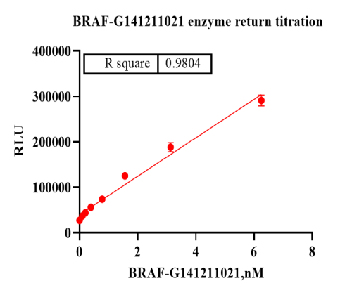 活性验证:ADP-Glo法检测BRAF蛋白的活性:将BRAF蛋白、ATP和底物在25℃下孵育60分钟,加入ADP-Glo试剂,最后在BMG上读取RLU信号。