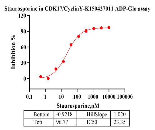 活性验证:ADP-Glo法检测CDK17/CyclinY蛋白的活性:将CDK17/CyclinY蛋白、ATP和底物在25℃下孵育60分钟,加入ADP-Glo试剂,最后在BMG上读取RLU信号。