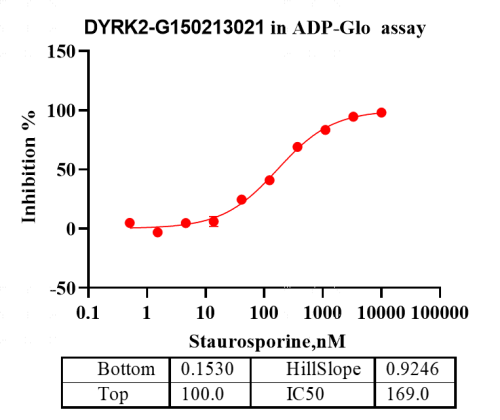 活性验证:ADP-Glo法检测DYRK2蛋白的活性:将DYRK2蛋白、ATP和底物在25℃下孵育60分钟,加入ADP-Glo试剂,最后在BMG上读取RLU信号。