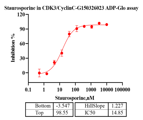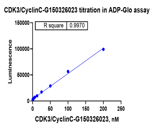 活性验证:ADP-Glo法检测CDK3/CyclinC蛋白的活性:将CDK3/CyclinC蛋白、ATP和底物在25℃下孵育60分钟,加入ADP-Glo试剂,最后在BMG上读取RLU信号。