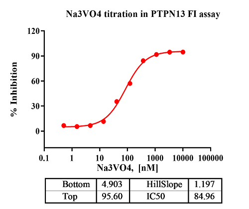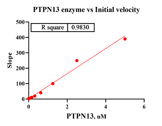活性验证:FI法检测PTPN13活性:将PTPN13蛋白和底物在25℃下孵育30分钟,在BMG读取RFU信号。