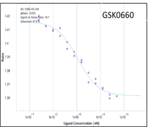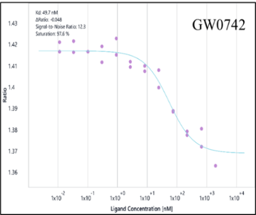 活性验证:Special shift-based法检测Biotin-PPARβ蛋白的活性:将用染料标记的Biotin-PPARβ蛋白和化合物在25℃下孵育15分钟,最后在Dianthus上读取670/650nm处荧光信号比值。