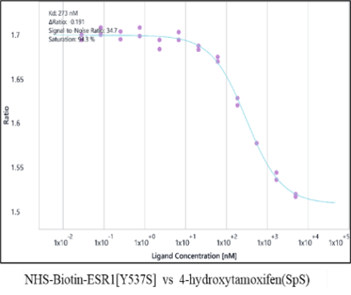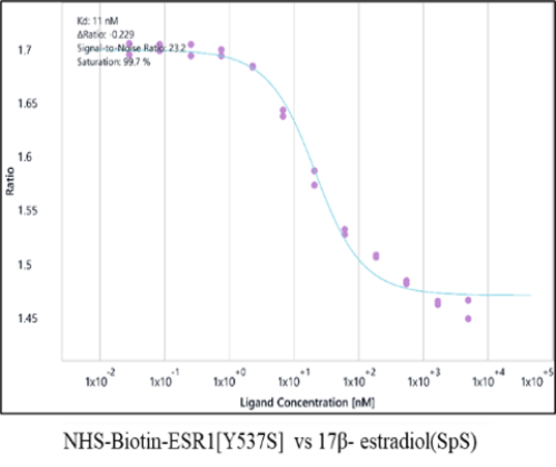 活性验证:Special shift-based法检测Biotin-ESR1[Y537S]蛋白的活性:将用染料标记的Biotin-ESR1[Y537S]蛋白和化合物在25℃下孵育15分钟,最后在Dianthus上读取670/650nm处荧光信号比值。