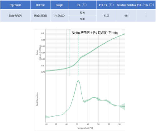 活性验证:nanoDSF法检测Biotin-WWP1蛋白的活性:将Biotin-WWP1蛋白与1%DMSO在25℃下孵育15 min,然后在PrometheusTM NT.48上加热反应混合物,温度范围为20℃~ 95℃,实时测量350/330 nm荧光信号比。
