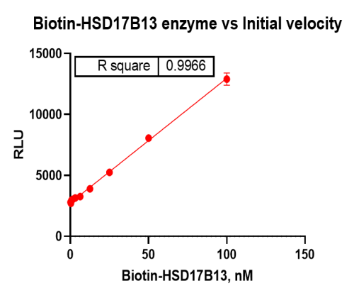 活性验证:NADPH-Glo法检测Biotin-HSD17B13蛋白的活性:将Biotin-HSD17B13蛋白和NAD+β-Estradiol在25℃下孵育60分钟,加入NAD(P)H-Glo™试剂,并在25℃下孵育60分钟,最后在BMG上读取RLU信号。
