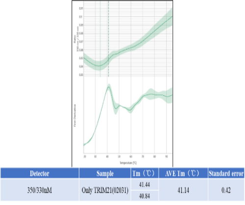 活性验证:NanoDSF法检测Biotin-TRIM21蛋白的活性:将Biotin-TRIM21蛋白在25℃下孵育15 min,然后在PrometheusTM NT.48上加热反应混合物,温度范围为20℃~ 95℃,实时测量350/330 nm荧光信号比。