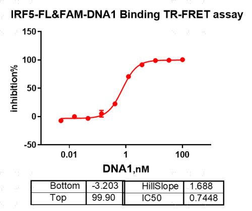活性验证:TR-FRET法检测Biotin-IRF5蛋白的活性:将Biotin-IRF5蛋白、底物、对应的供体和受体在25℃下孵育60分钟,最后在BMG上读取520nm/485nm荧光信号的比值。