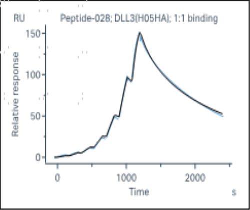 活性验证:SPR法检测Biotin-DLL3蛋白的活性:将Biotin-DLL3固定到SA芯片上,不同浓度的化合物流经Biotin-DLL3蛋白的固定表面,并记录响应信号。动力学拟合结果如下,kD值约为3.98x10-9 M。