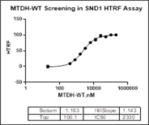描述:带有N端GST标签重组人MTDH蛋白通过GST亲和和SEC进行纯化。MTDH蛋白在HTRF检测中显示出高活性。