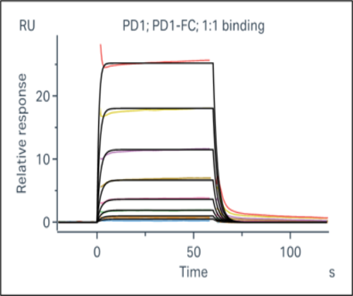 活性验证:SPR法检测PDL1蛋白的活性:将PDL1固定到CM5芯片上,不同浓度的PD1蛋白流经PDL1的固定表面,并记录响应信号。动力学拟合结果如下,kD值约为6x10-6 M。