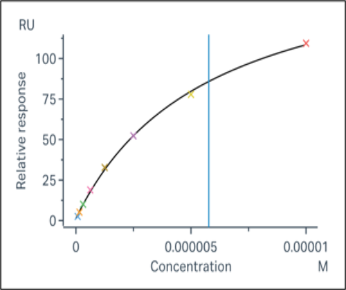 活性验证:SPR法检测PDL2蛋白的活性:将PD1固定到CM5芯片上,不同浓度的PDL2蛋白流经PD1的固定表面,并记录响应信号。动力学拟合结果如下,kD值约为5x10-6 M。