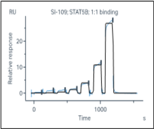 活性验证:SPR法检测STAT5B蛋白的活性:将STAT5B固定到CM5芯片上,不同浓度的化合物流经STAT5B蛋白的固定表面,并记录响应信号。动力学拟合结果如下,kD值约为2.8x10-5 M。