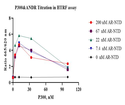 活性验证:HTRF法检测Biotin-ANDR(NTD)蛋白的活性:通过将Biotin-ANDR(NTD)蛋白、底物、对应的受体和供体在25℃下孵育60分钟,最后在BMG上读取665/620比值。