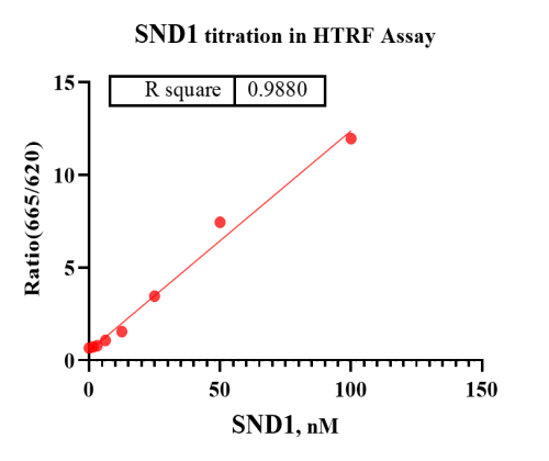 活性验证:HTRF法检测SND1蛋白的活性:通过将SND1蛋白、底物、对应的受体和供体在25℃下孵育60分钟,最后在BMG上读取665/620比值。