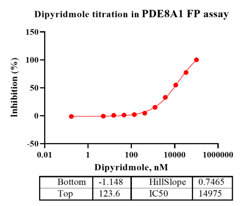 活性验证:FP法检测PDE8A1蛋白的活性:将PDE8A1蛋白和底物在25℃下孵育60分钟,加入结合试剂后在25℃下孵育60分钟,最后在BMG上读取FP信号。