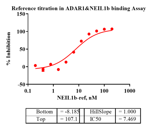 活性验证:HTRF法检测ADAR1(P110)蛋白的活性:将ADAR1(P110)蛋白、底物、对应的供体和受体在25℃下孵育60分钟,最后在BMG上读取665/620比值。