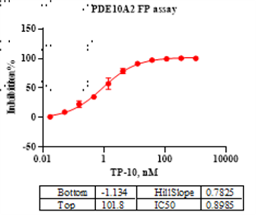 活性验证:FP法检测PDE10A2蛋白的活性:将PDE10A2蛋白、ATP和 FAM-Cyclic-3,5-AMP在25℃下孵育60分钟,加入binding试剂,最后在BMG上读取FP信号。
