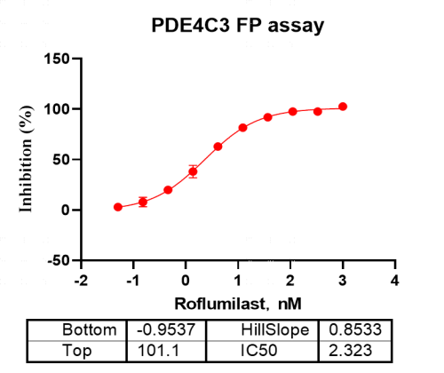 活性验证:一种基于FP的检测法量化测定PDE4C3蛋白的活性:将PDE4C3蛋白和底物在25℃下孵育60分钟,最后在BMG上读取FP信号值。