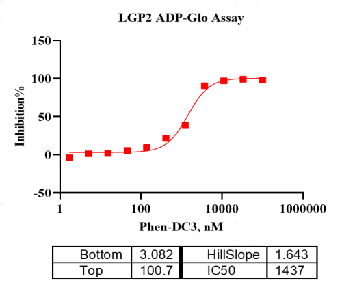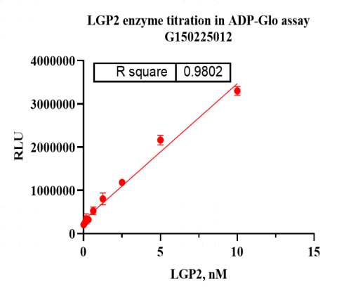 活性验证:ADP-Glo法检测LGP2蛋白的活性:将LGP2蛋白、ATP和底物在25℃下孵育60分钟,加入ADP-Glo试剂,最后在BMG上读取RLU信号。