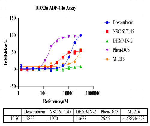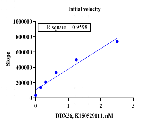 活性验证:ADP-Glo法检测Biotin-DHX36蛋白的活性:将Biotin-DHX36蛋白、ATP和底物在25℃下孵育60分钟,加入ADP-Glo试剂,最后在BMG上读取RLU信号。