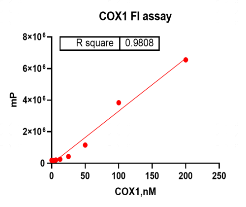 活性验证:FI法检测COX1蛋白的活性:将COX1蛋白和底物在25℃下孵育60分钟,最后在BMG上读取FI信号值。