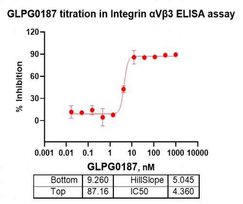活性验证:ELISA法检测Biotin-Vitronectin蛋白的活性:将Biotin-Vitronectin、αVβ3和不同浓度的GLPG0187在包被Biotin-Vitronectin的384孔板中孵育,然后加入链霉亲和素-HRP,紧接着加入ELISA ECL底物。最后,用化学发光读数仪读取信号值。