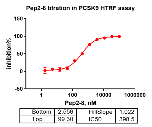 活性验证:HTRF法检测Biotin-PCSK9蛋白的活性:将Biotin-PCSK9蛋白、底物、对应的供体和受体在25℃下孵育60分钟,最后在BMG上读取665nm/620nm荧光信号的比值。