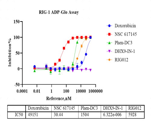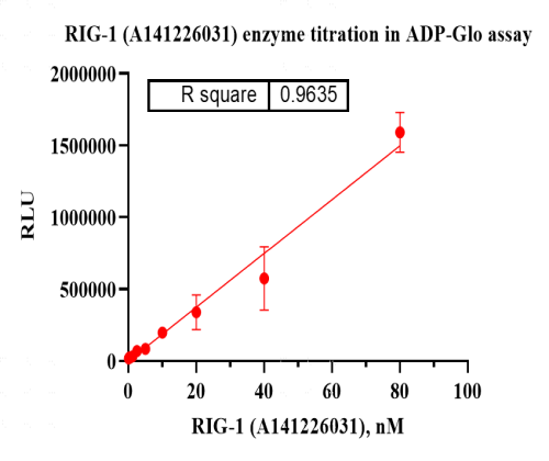活性验证:ADP-Glo法检测RIG-I蛋白的活性:将RIG-I蛋白、ATP和底物在25℃下孵育60分钟,加入ADP-Glo试剂,最后在BMG上读取RLU信号。