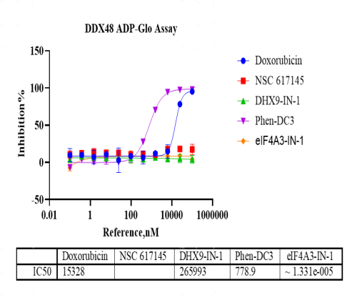活性验证:ADP-Glo法检测DDX48蛋白的活性:将DDX48蛋白、ATP和底物在25℃下孵育60分钟,加入ADP-Glo试剂,最后在BMG上读取RLU信号。