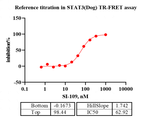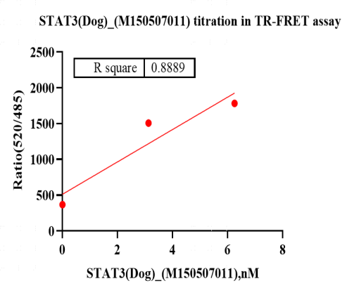 活性验证:TR-FRET法检测Biotin-STAT3蛋白的活性:将Biotin-STAT3蛋白、底物、对应的供体和受体在25℃下孵育60分钟,最后在BMG上读取520nm/485nm荧光信号的比值。