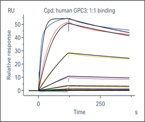 活性验证:SPR法检测Biotin-GPC3蛋白的活性:将Biotin-GPC3固定到CM5芯片上,不同浓度的化合物流经Biotin-GPC3蛋白的固定表面,并记录响应信号。动力学拟合结果如下,kD值约为9.57x10-9 M。
